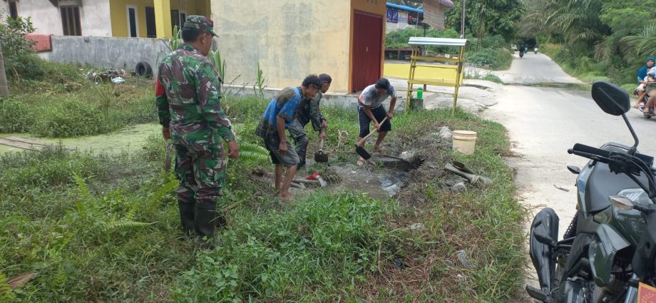 DUMAI — (Suaranegeri.id) — Babinsa Bukit Nenas, Serda Roni Sandra, (15/12), melaksanakan kegiatan gotong royong untuk membersihkan saluran drainase warga.