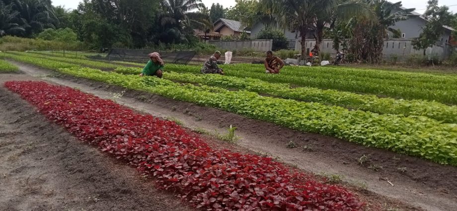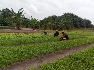 Pada hari Jumat (7/6), Serka Fahrizal Purba fokus pada penanaman sayur kangkung dan bayam di kebun milik warga, khususnya di RT 14 yang merupakan milik Sutarmi.