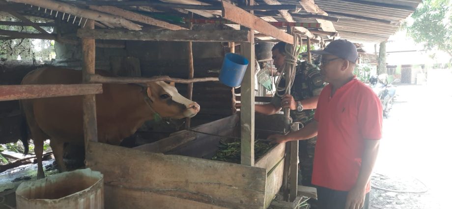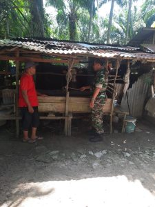 Pelda Hendrianto melakukan pendampingan dan pemantauan terhadap Tumirin (58), salah satu pemilik ternak sapi di Jalan Raja Laut RT 02 Kelurahan Pelintung Kecamatan Medang Kampai. Ia mengecek kesehatan sapi milik Tumirin dan memberikan saran-saran untuk menjaga kesehatan ternaknya.