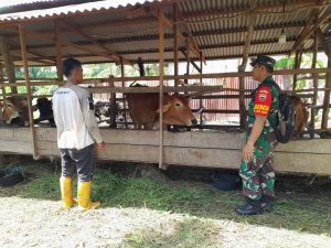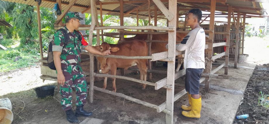 DUMAI — (SNI) — Kodim 0320/Dumai Babinsa Kelurahan Jaya Mukti Kecamatan Dumai Timur Pelda Sapi’i, Melaksanakan Pemantauan dan Pendampingan Peternak serta Sosialisasi Penyakit Mulut dan Kuku (PMK) di Wilayah Binaannya, (14/1).