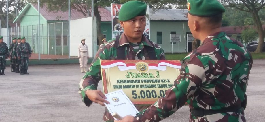 Dumai — (Suaranegeri.id) — Dandim 0320/Dumai Letkol Arh Hermansyah Tarigan SE.memberikan penghargaan bertempat di lapangan Upacara Makodim 0320/Dumai Jln.Sultan Syarif Kasim Kel.Teluk Binjai Kec.Dumai Timur pada hari Selasa Tgl 29 November 2022 kepada anggotanya berprestasi yang turut berjuang mengharumkan nama Satuan dengan meraih Emas di Porprov Riau ke-X Kuansing dari Cabor Tinju Kelas 80 Kg Putra.
