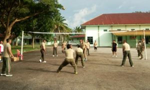 Prajurit Kodim 0320/Dumai melaksanakan olahraga Bola Voli dalam rangka memelihara kesehatan dan menjaga kebugaran Fisik di lapangan Voli Makodim 0320/Dumai Jln.Sultan Syarif Kasim Kel.Teluk Binjai Kec.Dumai Timur Kota Dumai Pada hari Jum’at 9 Desember 2022.