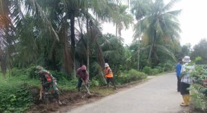 “Dengan sasaran pembersihan yaitu membuang tumpukan sampah, Pembersihkan parit, pemotongan rumput-rumput di pinggir jalan yang sudah lebat serta merapikan kiri kanan jalan di harapkan dengan kerja bakti ini masyarakat akan sadar akan kebersihan dan mengajarkan mereka tentang arti dari gotong royong,” Ujar Babinsa.