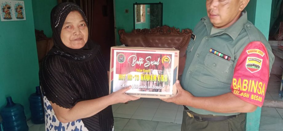 DUMAI — (SNI) — Babinsa Bagan Besar Ramil 02 BK, Sertu Sareh, pada hari Rabu tanggal 14 Juni 2023, melaksanakan penyerahan bantuan dari Komandan Kodim 0320/Dumai dalam program kegiatan bakti sosial menyambut HUT ke-73 Kodam I/BB. Bantuan tersebut berupa paket sembako yang diberikan kepada purnawirawan dan Warakawuri angkatan darat.