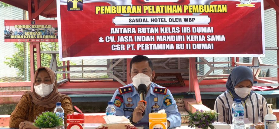DUMAI (Suaranegeri.id) — Kepala Rutan, Pejabat Struktural, dan Staf mengikuti pembukaan pelatihan pembinaan kemandirian pembuatan sandal hotel oleh WBP yang diselenggarakan antara Rutan Dumai dan CV. Jasa Indah Mandiri, hasil kerja sama CSR PT. Pertamina RU II Dumai bertempat di Gazebo Rutan Dumai pukul 14.00 Wib, Senin (27/06/2022).