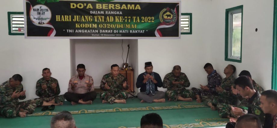 DUMAI —(Suaranegeri.id) — Kodim 0320/Dumai gelar Doa bersama dalam Rangka memperingati Hari juang TNI AD Ke 77 Tahun 2022-, bertempat Musholla Al-Iklas Makodim 0320/Dumai Jln.Sultan Syarif Kasim Kel.Teluk Binjai Kec.Dumai Timur Pada hari Kamis 15 Desember 2022.