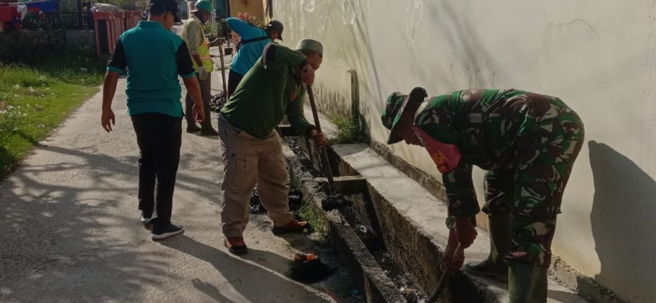 DUMAI — (SNI) — Babinsa dari Koramil 01 Kelurahan Pangkalan Sesai, Kecamatan Dumai Barat, Serda Agustinus Hasugian, bersama warga setempat, melaksanakan giat gotong royong untuk membersihkan parit dan selokan air di sekitar jalan Nelayan laut RT 13 dan 14 pada Kamis (9/3/2023).