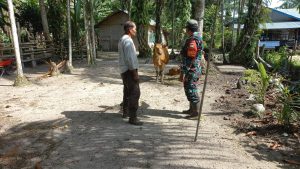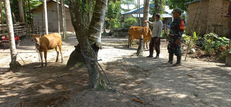 DUMAI — (SNI) — Babinsa Kelurahan Bukit Kapur Serda Roni Sandra melaksanakan pemantauan ternak untuk mencegah Penyakit Mulut dan Kuku (PMK) di salah satu peternakan milik masyarakat, (19/1).